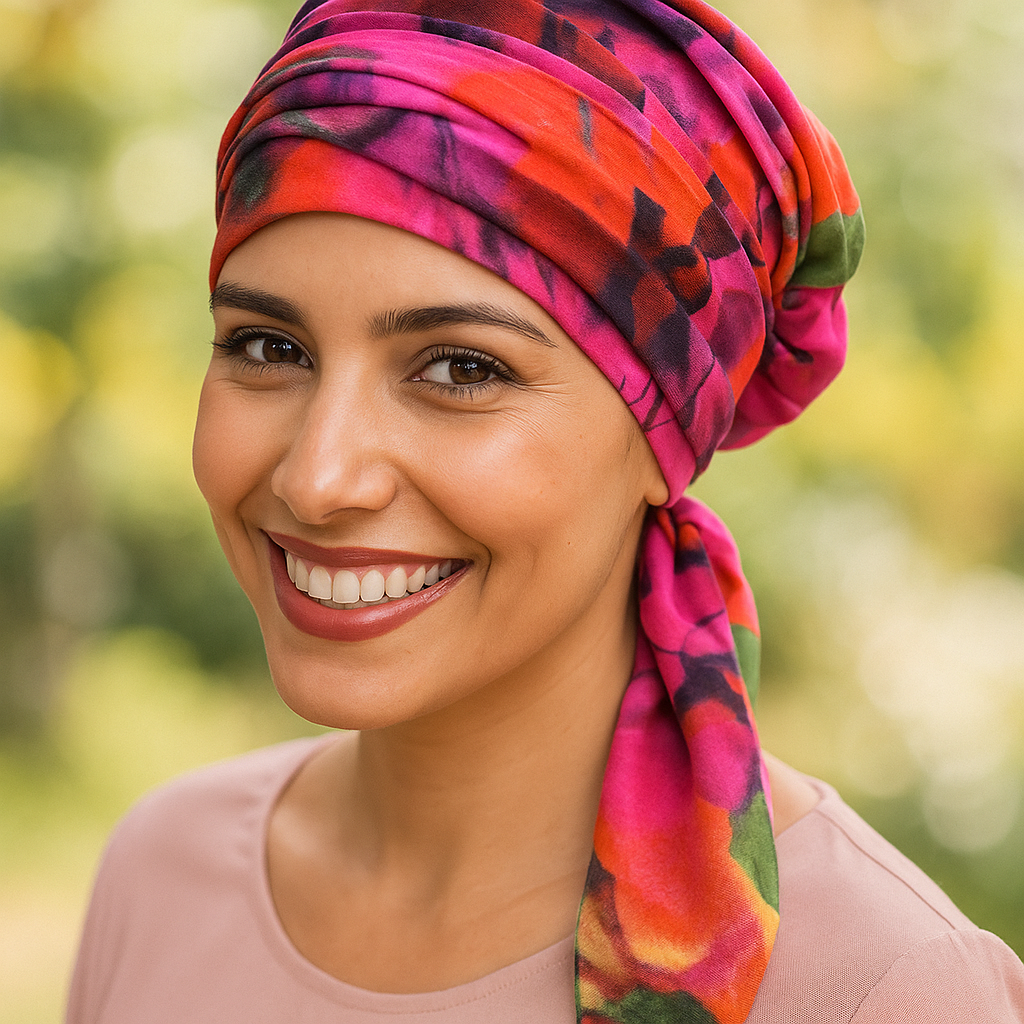 🌸 Descubre el pañuelo oncológico Lara with Ribbons, una opción elegante y cómoda diseñada especialmente para quienes enfrentan el desafío de la oncología y la alopecia.